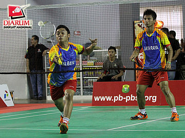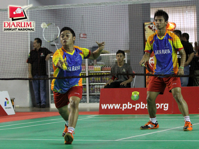 Pasangan ganda putra taruna Jaya Raya, M. Alvian Sangaji (kiri) dan partnernya, Aldo Abdillah langsung menyambar serve lawannya.