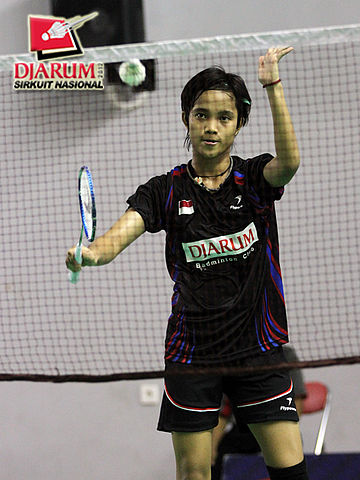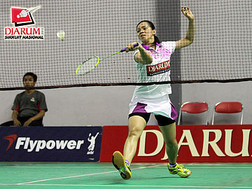 Febby Agguni (PB Djarum Kudus) mengembalikan bola ke arah Dinar Dyah.