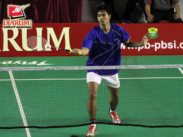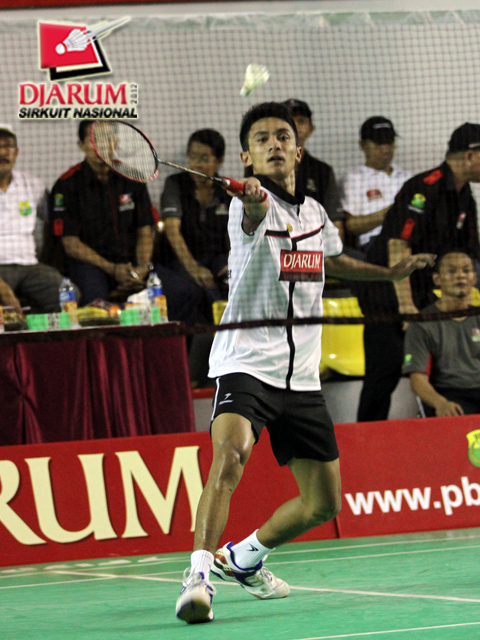 Thomi Azizan (PB Djarum Kudus) berusaha mengembalikan bola ke arah Gesstano Ganendra (Tangkas Specs).
