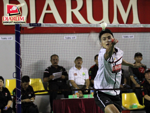 Gesstano Ganendra (Tangkas Specs) saat menyambut serve dari Thomi Azizan (PB Djarum Kudus).