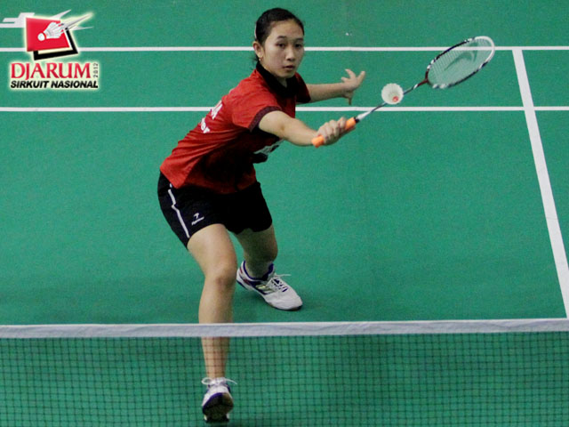 Intan Dwi Jayanti (Djarum Kudus) Mencoba Meraih Bola untuk Dikembalikan kepada Lawan