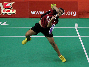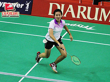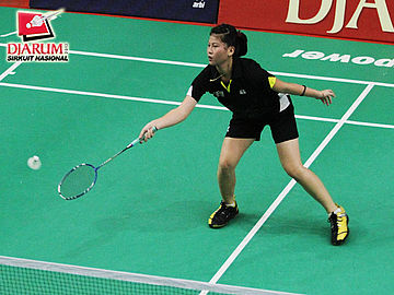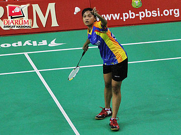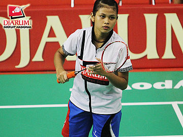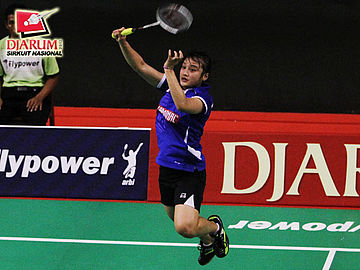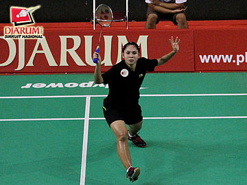Ganis Nurahmadani (Pertamina Indonesia) sedang berusaha mengejar kok untuk dikembalikan kepada lawannya, Maya Rosita (Puslada).