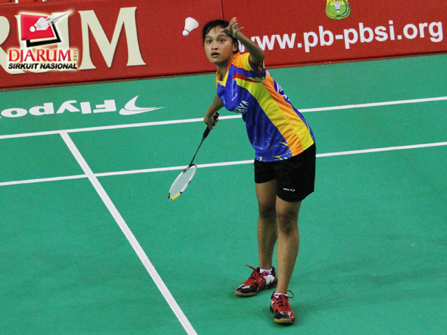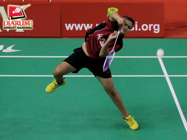 Maya Rosita (Puslada) sedang memukul kok untuk dikembalikan kepada lawannya, Ganis Nurahmadani (Pertamina Indonesia).