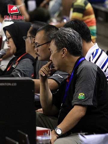 Tim referee sedang mengawasi jalannya pertandingan Djarum Sirnas Jambi Open 2012.