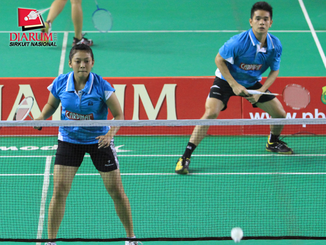 Pasangan Ganda Taruna Campuran asal Mutiara Bandung, Mareta Dea Giovani (depan) yang berpasangan dengan Bagus Haryanto (belakang) sedang bersiap-siap memukul kok.