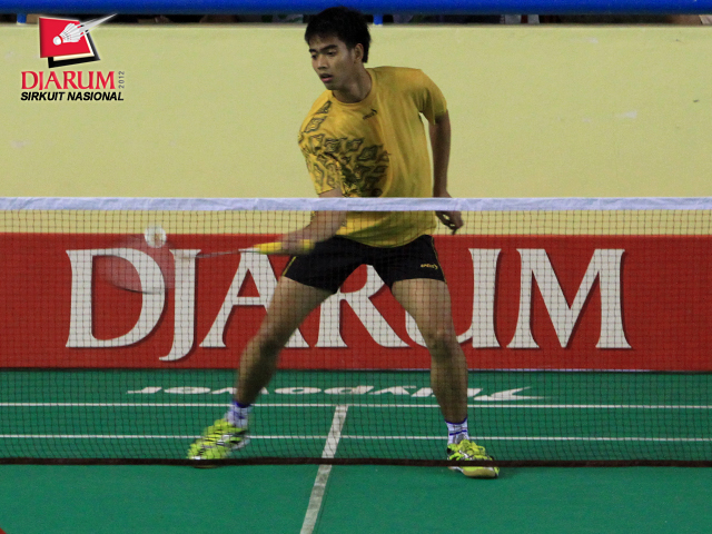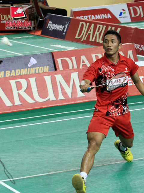 Pandu Dewantoro dari PB Djarum mengembalikan kok ke Ronal Fazrin dari Pelabuhan Indonesia II. Dalam pertandingan tersebut, Pandu menang 23-21, 19-21, dan 21-15 atas Ronal.