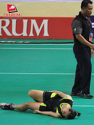 Pemain Tangkas Alfamart, Rusydina Antardayu Riodingin mengalami cidera saat bertanding melawan Tike Arieda Ningrum dari Jaya Raya Suryanaga.