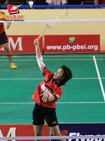 Syafitri Nur Azizah asal PB Djarum sedang bersiap-siap melakukan smash saat bertanding melawan rekan se-klubnya, Aida Arum Amanah.