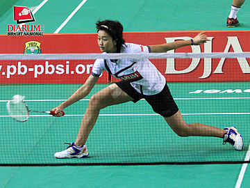 Pemain Ganda Taruna Putri, Tresna Navelia jatuh tersungkur saat berusaha mengejar kok.