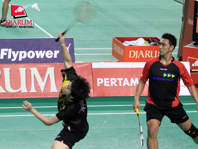 Lita Nurlita dari SGS PLN Bandung (depan) yang berpasangan dengan Ardiansyah Putra dari Pertamina Indonesia (belakang) tengah bersiap-siap untuk memukul kok dalam pertandingan final Ganda Dewasa Campuran.