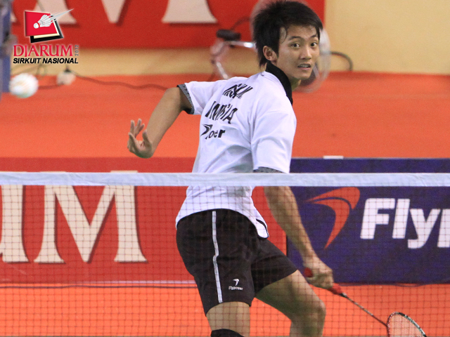 Pemain Tunggal Remaja Putra, Ikhsan Maulana Mustofa dari PB Djarum mellakukan smash ke arah pemain Pelatprov DKI, Rifan Fauzin Ivanudin.