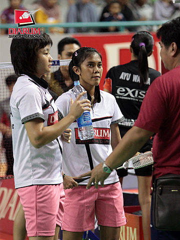 Pasangan Farah Amalia Triyani/Gibertha Agnestia Suhendra dari PB Djarum sedang mendapatkan pengarahan dari pelatih saat break pertandingan melawan pasangan Ayu Wanda/Neng Wulan dari PB Exist Jakarta.