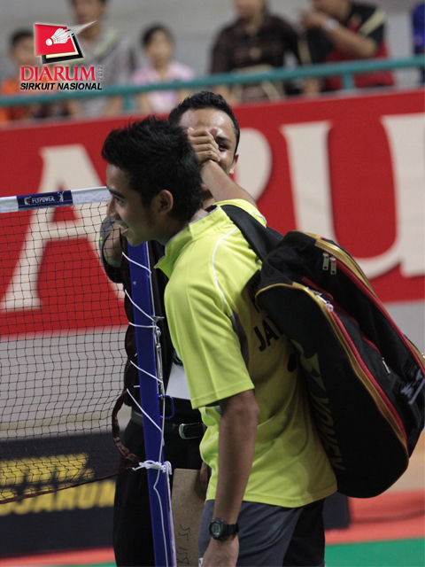 Hermansyah dari PB Jaya Raya Jakarta bersalaman dengan wasit usai dinyatakan menang walkover setelah lawannya, Jauhari dari PB KAI tidak muncul di lapangan.