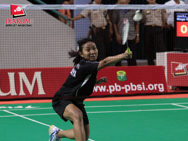 Ekspresi Mega Cahya dari PB Jaya Raya Jakarta saat mengejar bola dalam pertandingan melawan Neng Wulan dari PB Exist Jakarta di nomor tunggal dewasa putri.