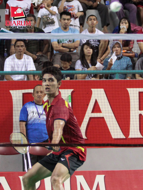 Pemain Jaya Raya Suryanaga Fauzi Adnan melakukan smash dalam pertandingan melawan Bandar Sigit Pamungkas dari PB Djarum. Fauzi menang 21-9 dan 21-11 dari Bandar.