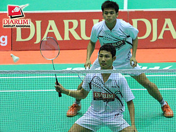 Hantoro yang berpasangan dengan Arsya Isnanu Ardi Putra (Djarum Kudus) siap mengembalikan kok yang di oper oleh pasangan R. Eka Fajar Kusuma / Rian Swastedian dari Pusdiklat Jayaraya.