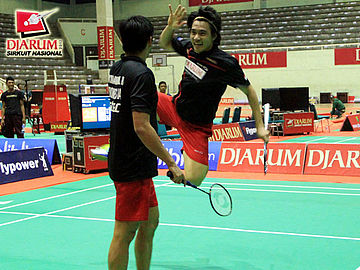 Rizki Yanu Kresnayandi yang berpasangan dengan Albert Saputra (Djarum Kudus) sedang memukul kok untuk dikembalikan kepada pasangan dari Jepang, Komacia/ Susuki.