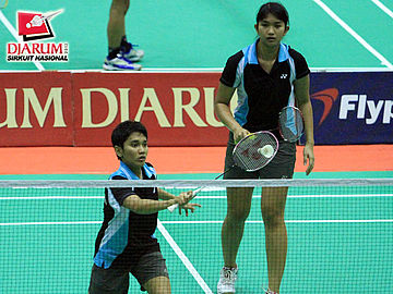 Ririn Amelia yang berpasangan dengan Deariska Putri Medita (Pelatnas) sedang mengembalikan serve yang diberikan oleh pasangan Nadia Melati / Vita Marissa (Tangkas Specs).