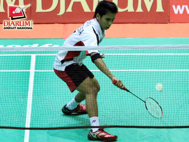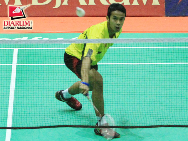 Alamsyah Yunus (Pertamina) sedang mengembalikan kok kepada Febriyan Irvannaldi dari PBSI Jatim pada laga semi final.