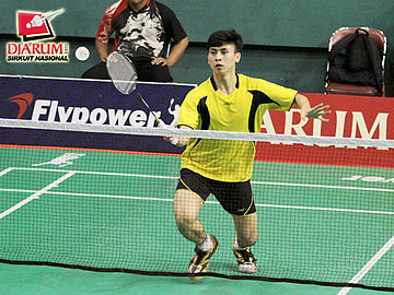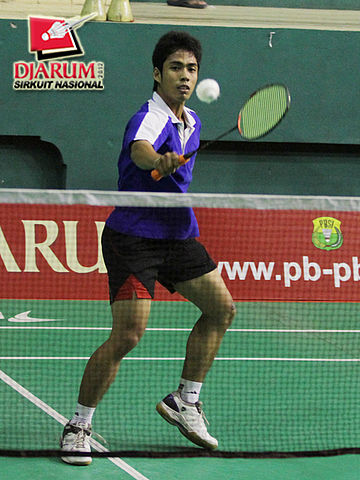 Panji Akbar (Pelatnas) langsung menyambar bola tanggung yang dilepaskan Pandu Dewantoro (PB Djarum Kudus).