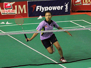 Millicent Wiranto (Pelatnas) berusaha menggapai bola dropshoot yang dilepaskan Samantha (Pelabuhan II).