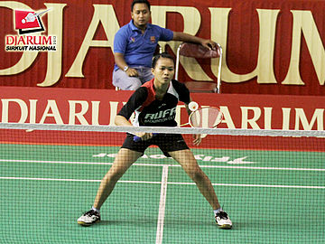 Lidya Ananta (PTP) mengejar bola smash menyilang yang diberikan Millicent Wiranto (Pelatnas).