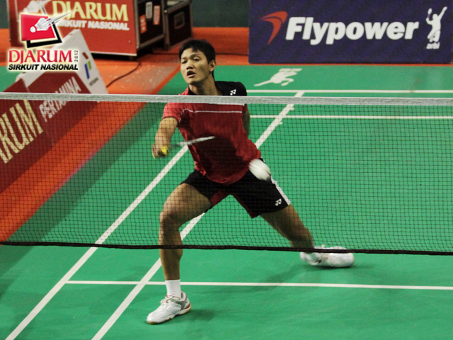 Kelvin SUnaryo (Exist) berusaha mengembalikan bola ke arah Muhammad Bagus (PB Djarum Kudus).