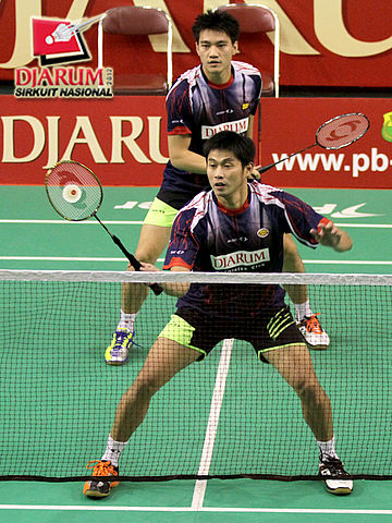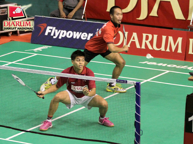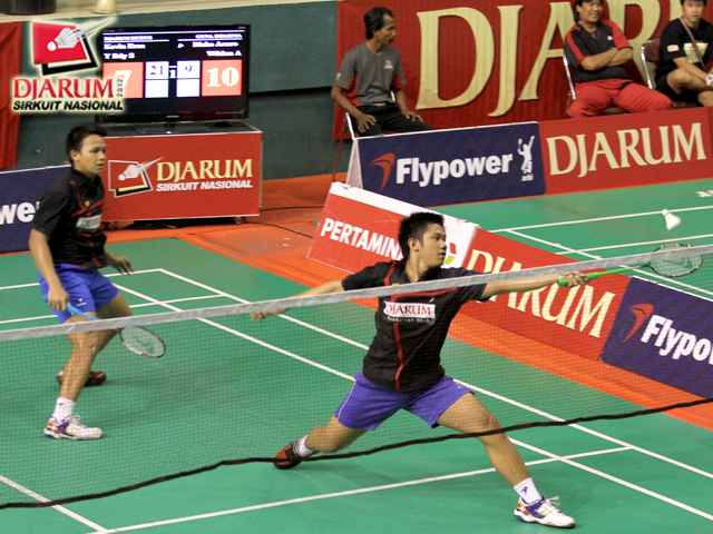 Unggulan pertama ganda dewasa putra, Rendra Wijaya/Rian Sukmawan (PB Djarum Kudus) bersiap mengembalikan bola ke arah pasangan Ade Yusuf/Wahyu Nayaka (Pelatnas).