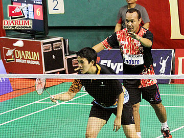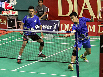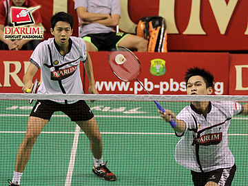 Chrisna Adi/Ridho AKbar (Ganesha) menyambut serve dari Rangga Yave/Sigid Sudrajat (PB DJarum Kudus).