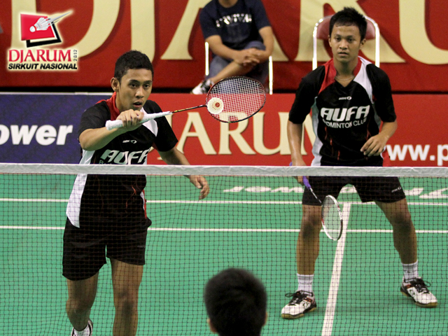 Sidik/Tegar (Aufa Kalsel) menyambut serve yang diberikan Ricky Alverino/Abu Bakar (PB Djarum Kudus).
