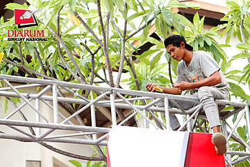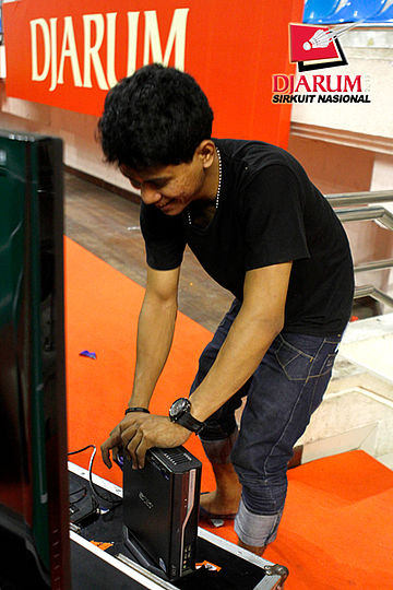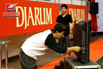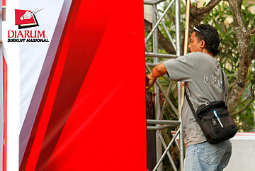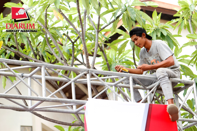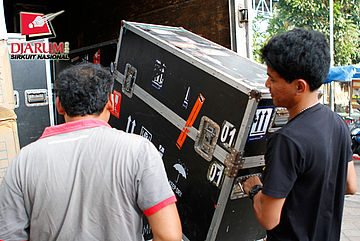 Dua pekerja saling bekerja sama untuk memindahkan perlengkapan Djarum Sirkuit Nasional 2013 dari truk ke dalam GOR Lila Bhuana, Bali.