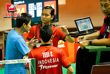Tedi Supriadi/Chintia Rhizta (PB Djarum) saat mendapatkan pengarahan dari Rian Sukmawan.
