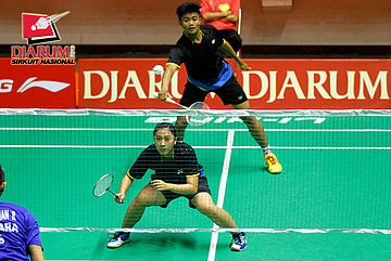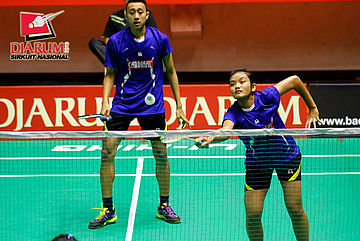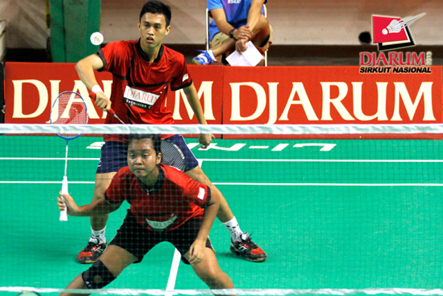 Tedi Supriadi/Chintia Rhizta (PB Djarum) bersiap menghadang serangan yang dilepaskan pasangan Richard Kuncoro/Meirisa Cindy (Jaya Raya Suryanaga).
