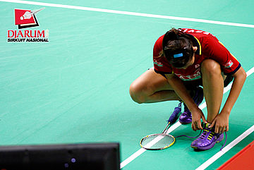 Ervine Felicia (Jaya Raya Suryanaga) mengikat tali sepatunya yang terlepas saat bertanding.