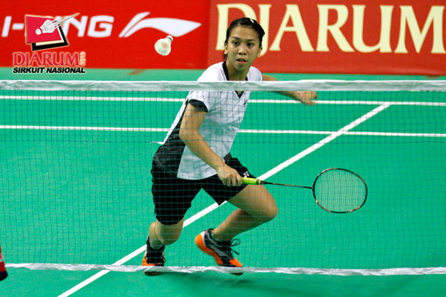 Egy/Inten Ratnasari (SGS PLN) mengembalikan shuttlecock ke arah Rafli Rizki/Novalita Anggraeni (Mutiara Bandung).