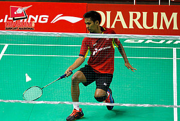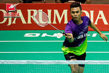 Krishna Adi (Jaya Raya Suryanaga) bersiap menyambut pengembalian shuttlecock dari Eka Fajar (Jaya Raya).