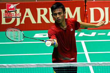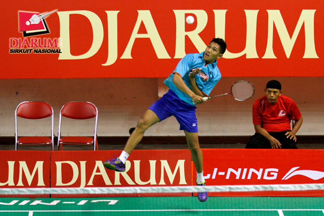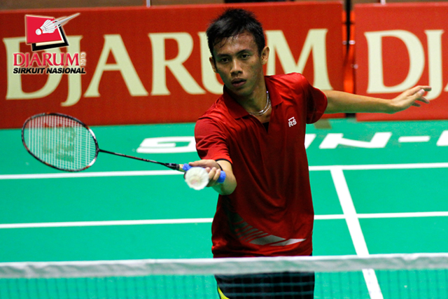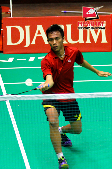 Alamsyah Yunus (Pertamina Indonesia) mengembalikan shuttlecock ke arah Made Chandra (PBSI Buleleng).