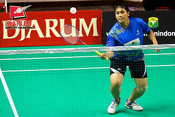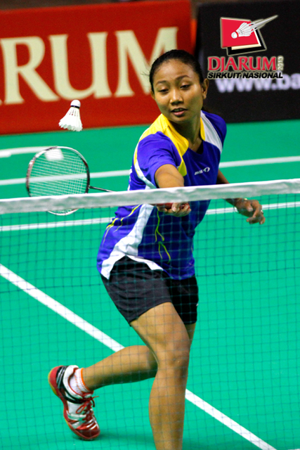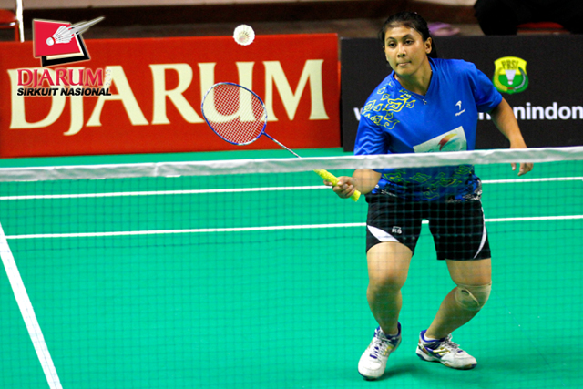 Samantha Lintang (IPC) bersiap menyambut pengembalian shuttlecock dari Mega Cahya (Jaya Raya).