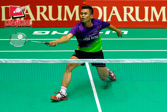 Joyireh Avi Manasye (PB Djarum) bersiap mengembalikan shuttlecock ke arah Nova Permana (Pelita Bakrie).