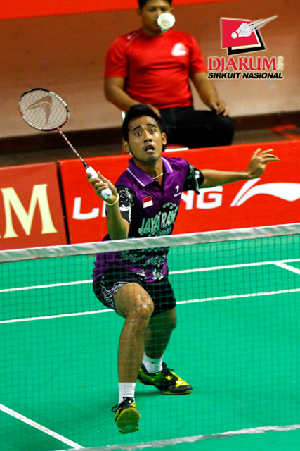 Feby Ardiansyah (Mutiara Bandung) bersiap menyambar pengembalian shuttlecock dari I Putu Roy Danu (Semen Gresik).