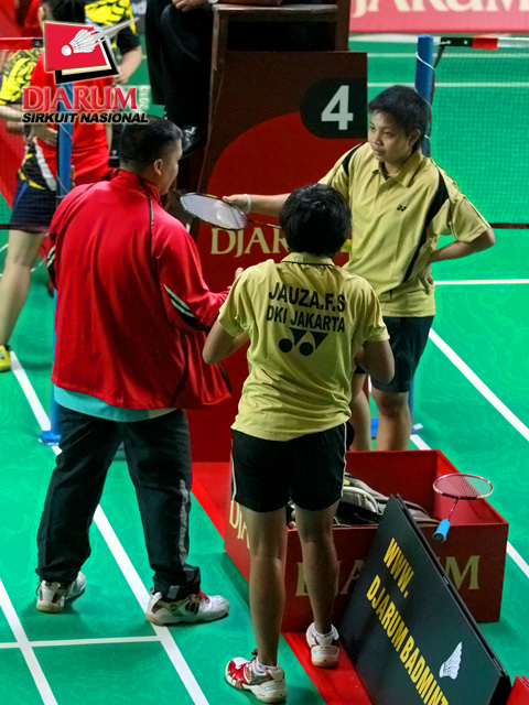 Apriani Rahayu/Jauza Fadhila (Pelatprov DKI Jakarta) saat mendapatkan pengarahan dari pelatih.