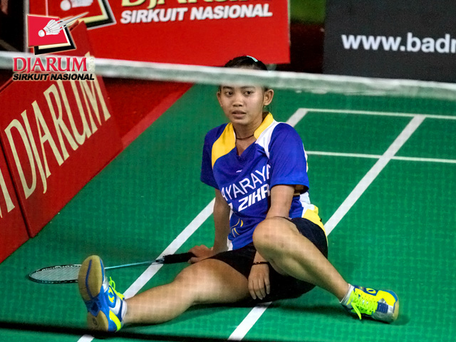 Syifa Fauziah (Jaya Raya Az Zikra) sampai harus jatuh bangun untuk membendung serangan dari Erlin Rusmawati/Rycha Widy (Pratama).