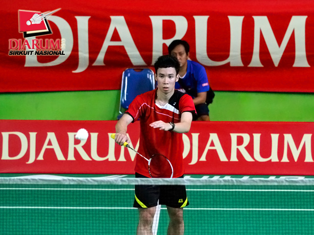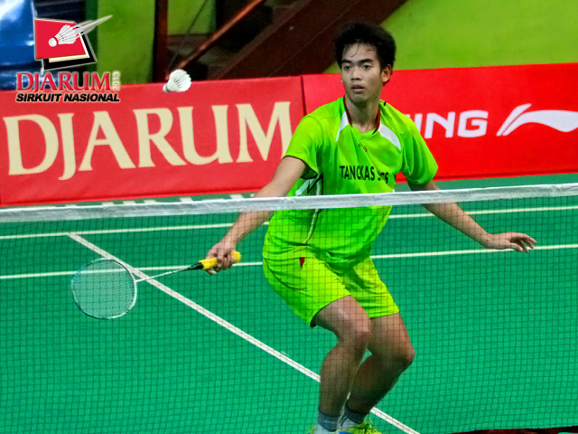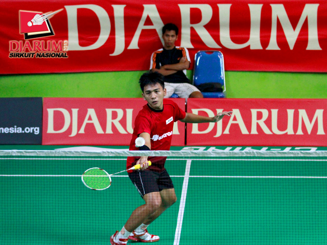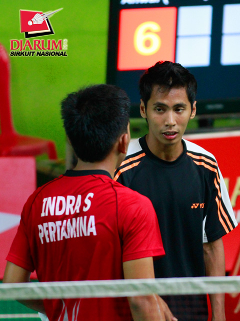 Indra Setiawan (Pertamina Indonesia) dengan tenang mengembalikan kok ke arah Andre Marteen (Mutiara Bandung).