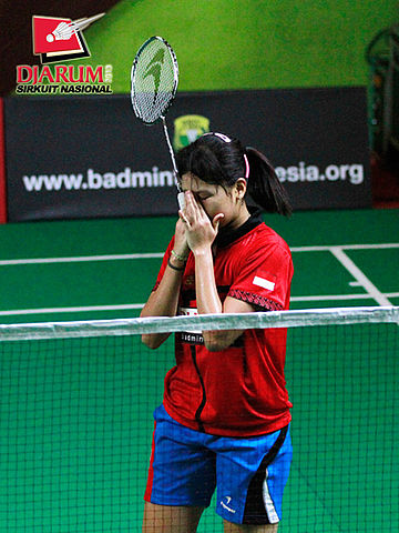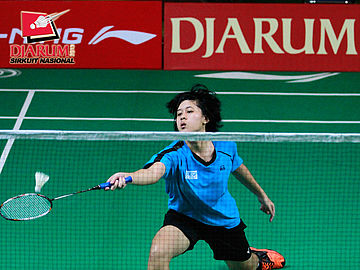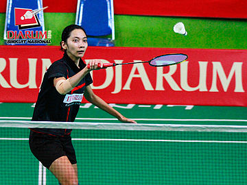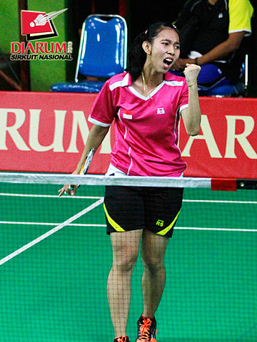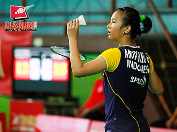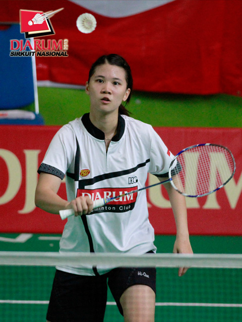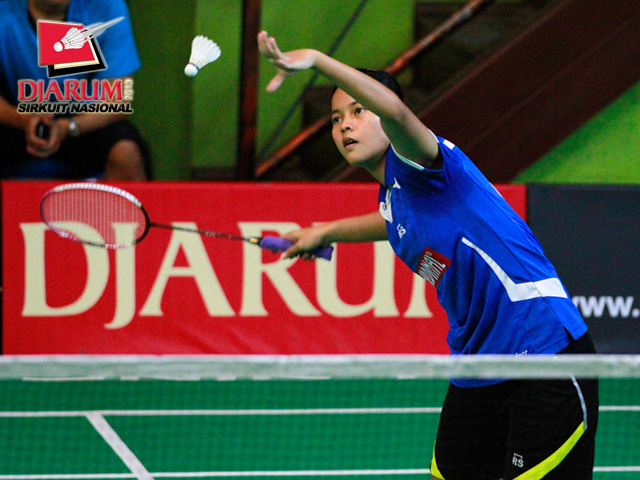 Mega Cahya (Pusdiklat Jaya Raya) menggembalikan kok ke arah Sylvinna Kurniawan (PB Djarum).