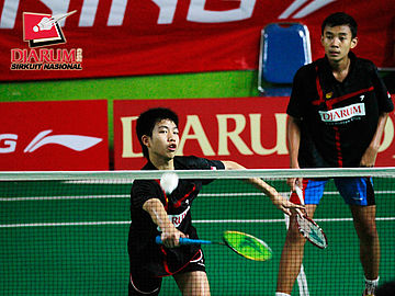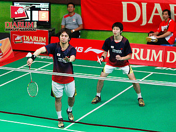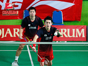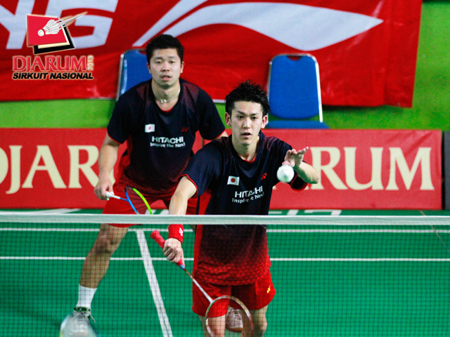 Hendra Setyo/Wifqi Windiarto (Jaya Raya Suryanaga/PB Djarum) berusaha mengembalikan kok ke arah pasangan Kazuaki Oshima/Tomoki Mitsuhashi (Hitachi Jepang).