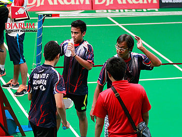 Engga Nur/Fachriza Abimanyu (Pusdiklat Jaya Raya) saat diberikan pengarahan pelatih di jeda set pertama.