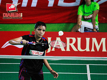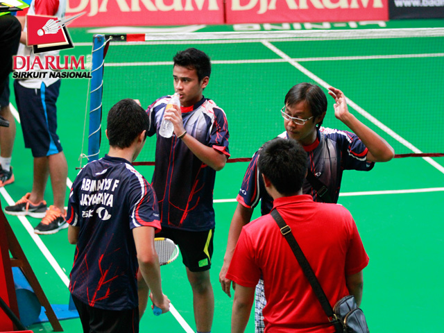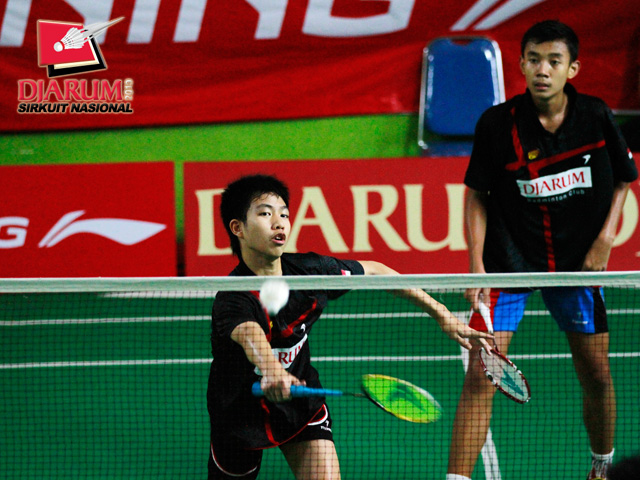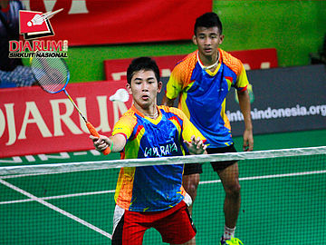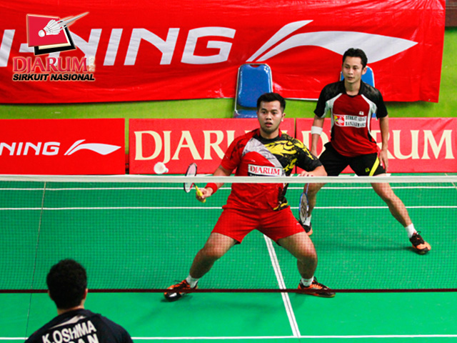 Bagas Maulana/Henry Jansen (PB Djarum) menyambut serve dari pasangan M. Yusril/Zulfikar Setiawan (Tangkas Specs).