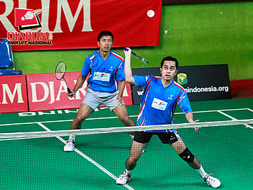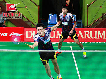 Rendra Wijaya/Rian Sukmawan (Musica Champion) menyambar pengembalian tanggung dari Hidayat Setiawan/Joko Aji (Tangkas Specs).