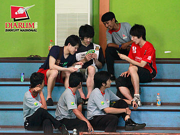 Tiga pebulutangkis Hitachi Jepang terlihat sedang bermain kartu dengan beberapa wasit saat jeda ISHOMA.