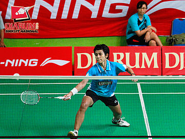 Putri Sekartaji (Mutiara Bandung) berusaha menggembalikan kok ke arah Arinda Sari (PB Djarum).